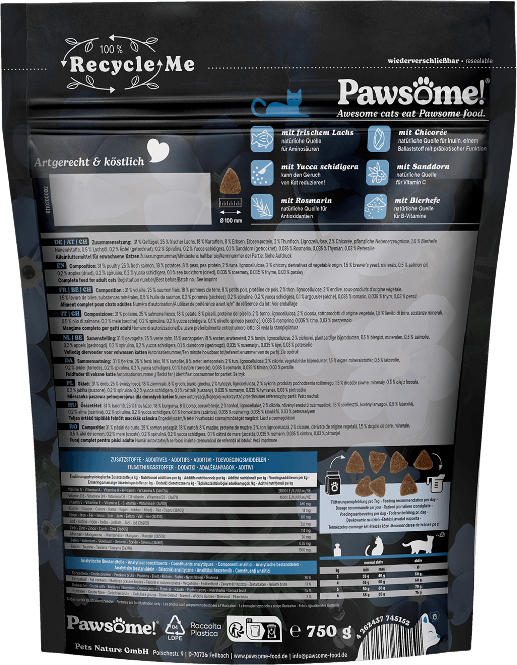 31 % volaille, 25 % saumon frais, 18 % pommes de terre, 8 % petits pois, protéine de pois, 2 % thon, lignocellulose, 2 % chicorée, sous-produits végétaux, 1,5 % levure de bière, Mineralstoffe, 0,5 % huile de saumon, 0,2 % pommes séchées, 0,2 % spiruline, 0,2 % Yucca schidigera, 0,1 % argousier, 0,035 % Rosmarin, 0,035 % thym, 0,03 % persil