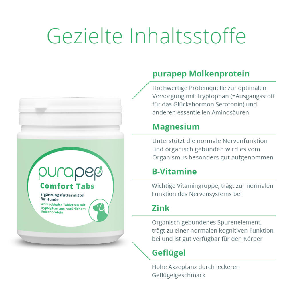 Les purapep - Comfort Comprimés pour Chien sont un aliment complémentaire de haute qualité sous forme de comprimés, conçu pour offrir un soutien naturel aux chiens dans les situations stressantes ainsi que face aux défis du quotidien.