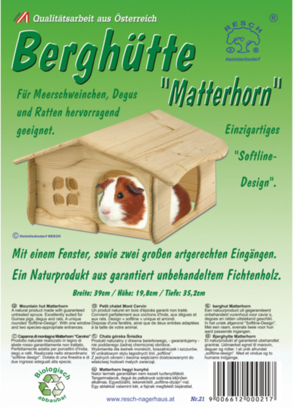RESCH est une entreprise artisanale autrichienne qui s'est spécialisée dans la fabrication de maisonnettes robustes pour rongeurs de différentes tailles. Tous les modèles ont en commun le choix des matériaux : du bois d'épicéa massif non traité, de la colle inoffensive et des clous minuscules (utilisés avec parcimonie et travaillés avec soin) garantissent le bonheur des rongeurs sans aucun risque.