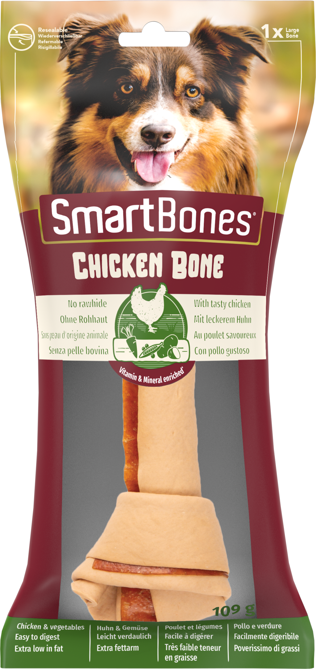 Les os à mâcher taille "large" au poulet de SmartBones sont sans peau, mais pleins de caractère ! La viande de poulet délicieuse à l'intérieur de l'os est enrobée d'une couche aux délicieux légumes (petits pois, carottes, patates douces). Avec une faible teneur en matières grasses et faciles à digérer, les os à mâcher sont enrichis en vitamine E et autres minéraux précieux.