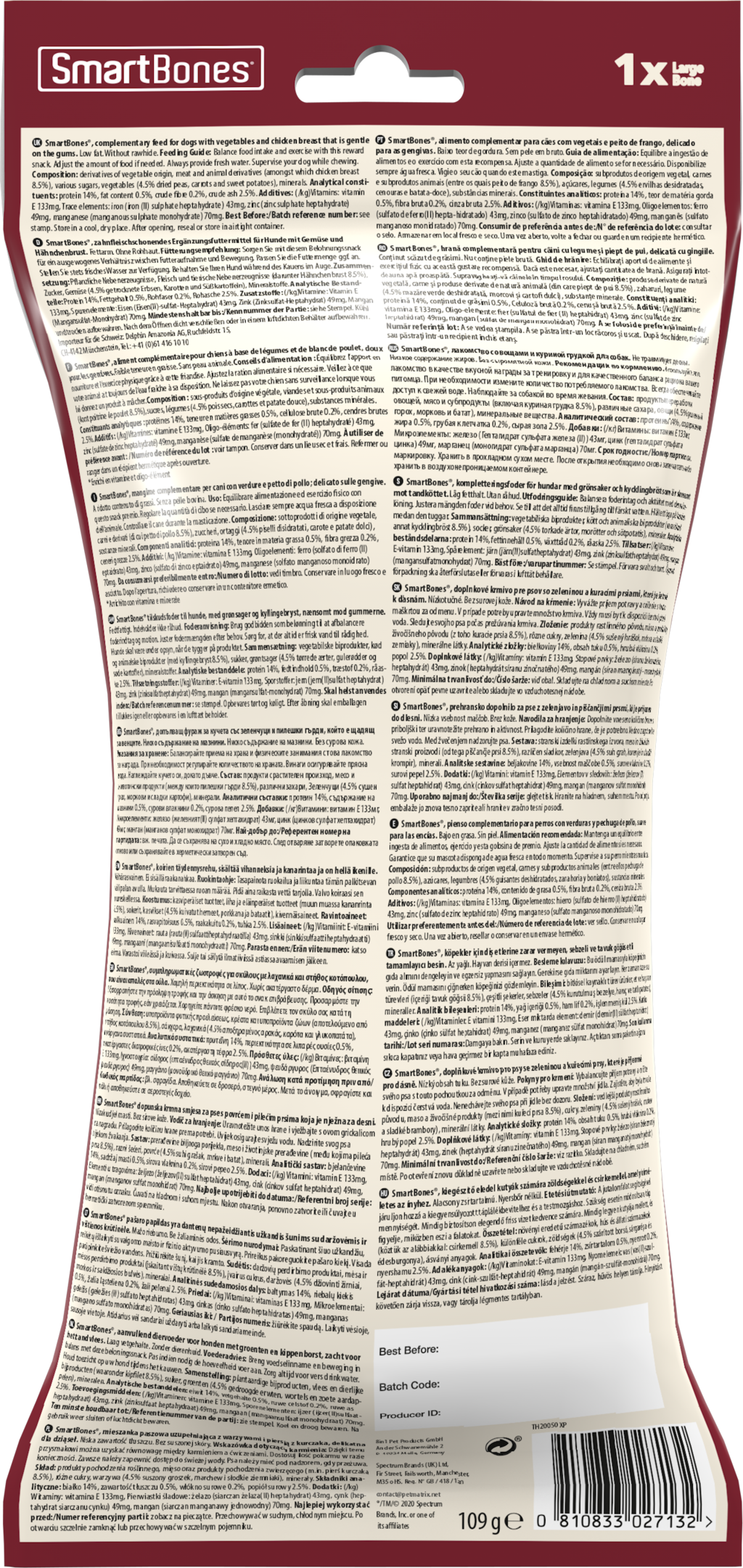 Les os à mâcher de taille "medium" au poulet de SmartBones sont sans peau, mais pleins de caractère ! La viande de poulet délicieuse à l'intérieur de l'os est enrobée d'une couche aux délicieux légumes (petits pois, carottes, patates douces). Avec une faible teneur en matières grasses et faciles à digérer, les os à mâcher sont enrichis en vitamine E et autres minéraux précieux.