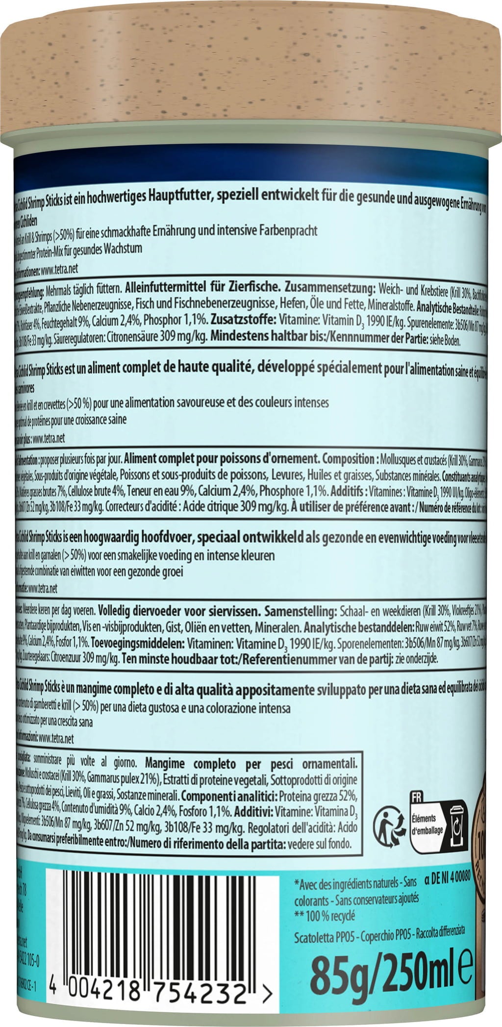 - Tetra Cichlid Shrimp Sticks se présente sous forme de bâtonnets à distribuer plusieurs fois par jour, en quantités que les poissons peuvent consommer en quelques minutes.