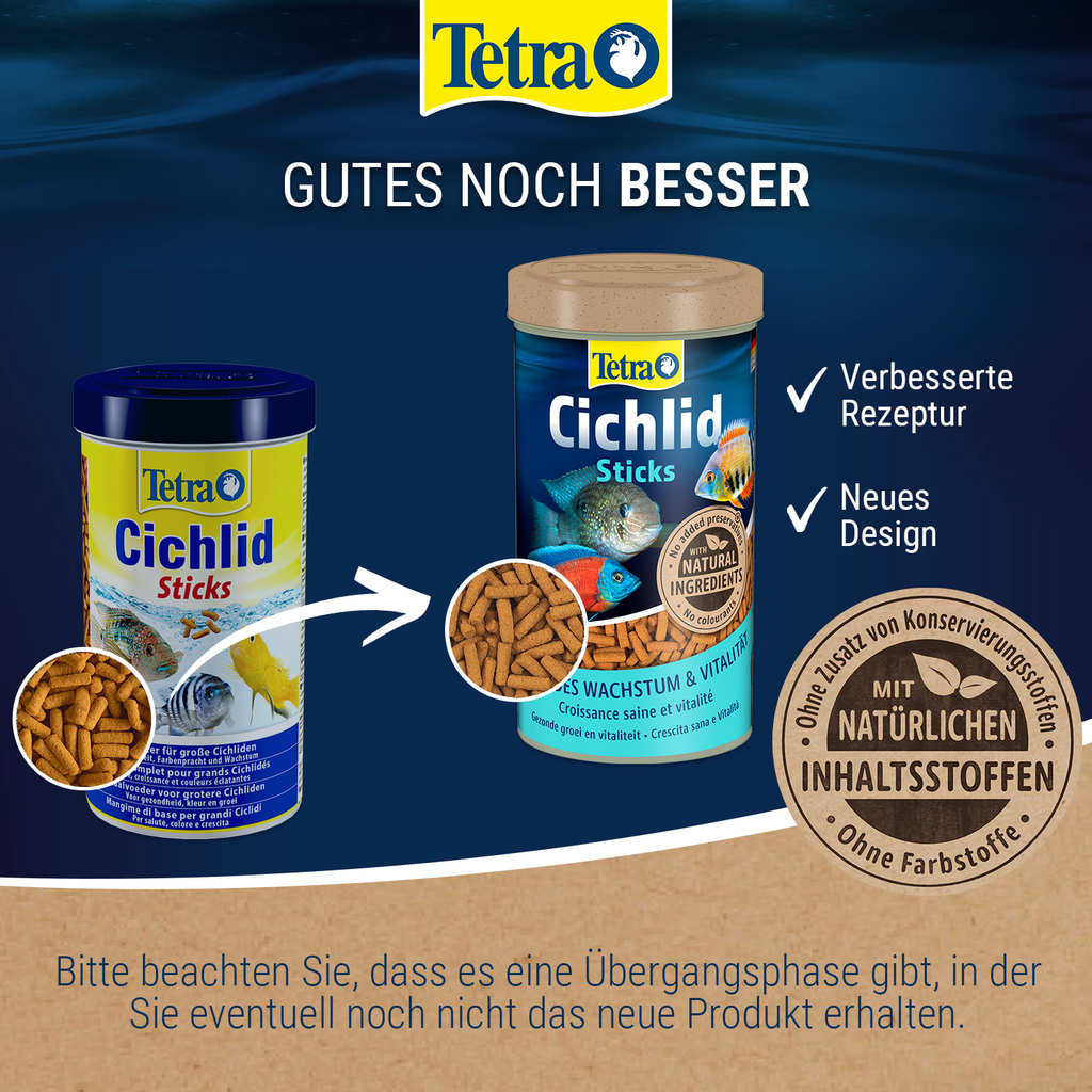 Tetra Cichlid Sticks est un aliment principal de qualité supérieure sous forme de bâtonnets, conçu pour tous les cichlidés et autres grands poissons d'ornement des aquariums d'eau douce.