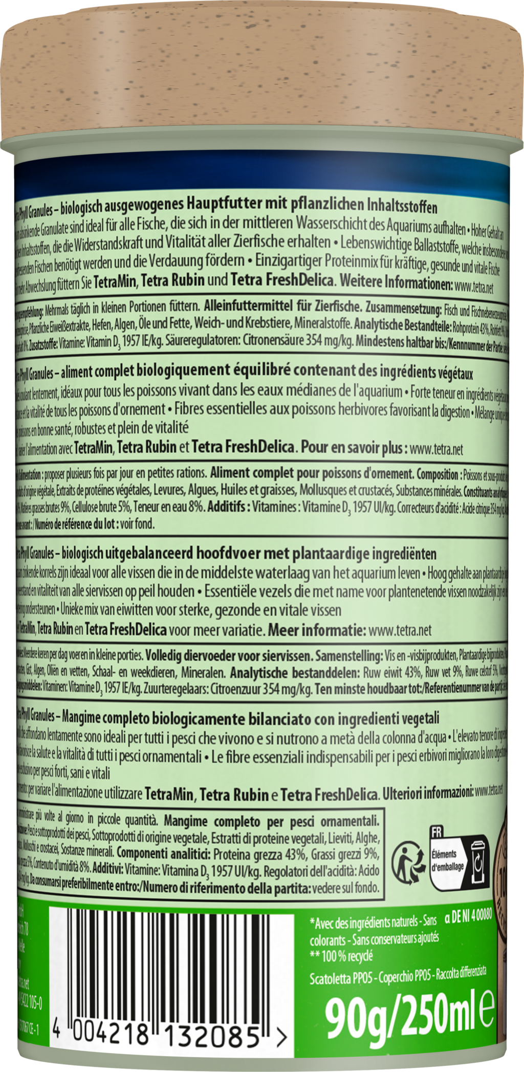 TetraPhyll Granules est un aliment principal biologiquement équilibré, conçu pour tous les poissons d'ornement herbivores des aquariums d'eau douce.