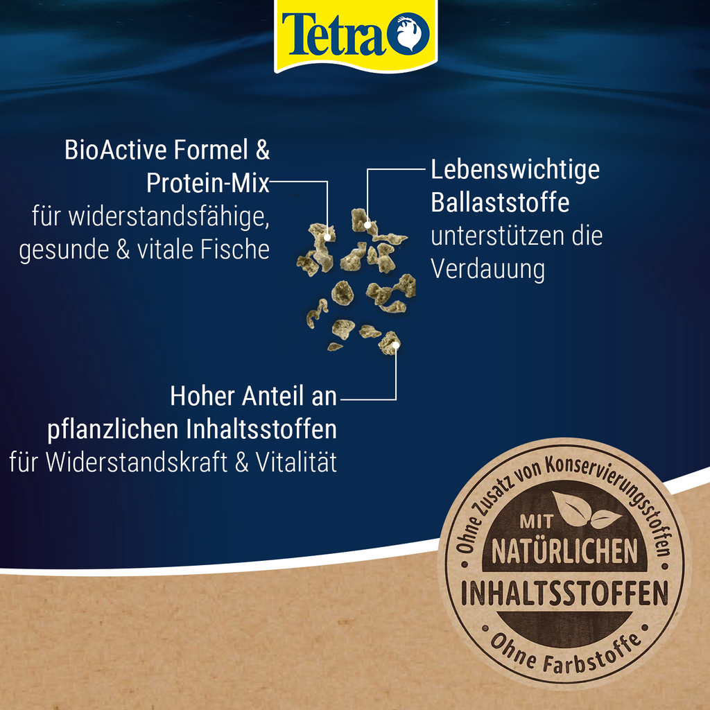 Sa formulation de qualité supérieure, composée d’ingrédients naturels, d’un mélange spécial de protéines, d’une formule BioActive, ainsi que de prébiotiques ajoutés, sans colorants ni conservateurs, soutient les fonctions corporelles normales et la vitalité des poissons. De plus, sa haute digestibilité contribue à maintenir l’eau de l’aquarium propre plus longtemps.