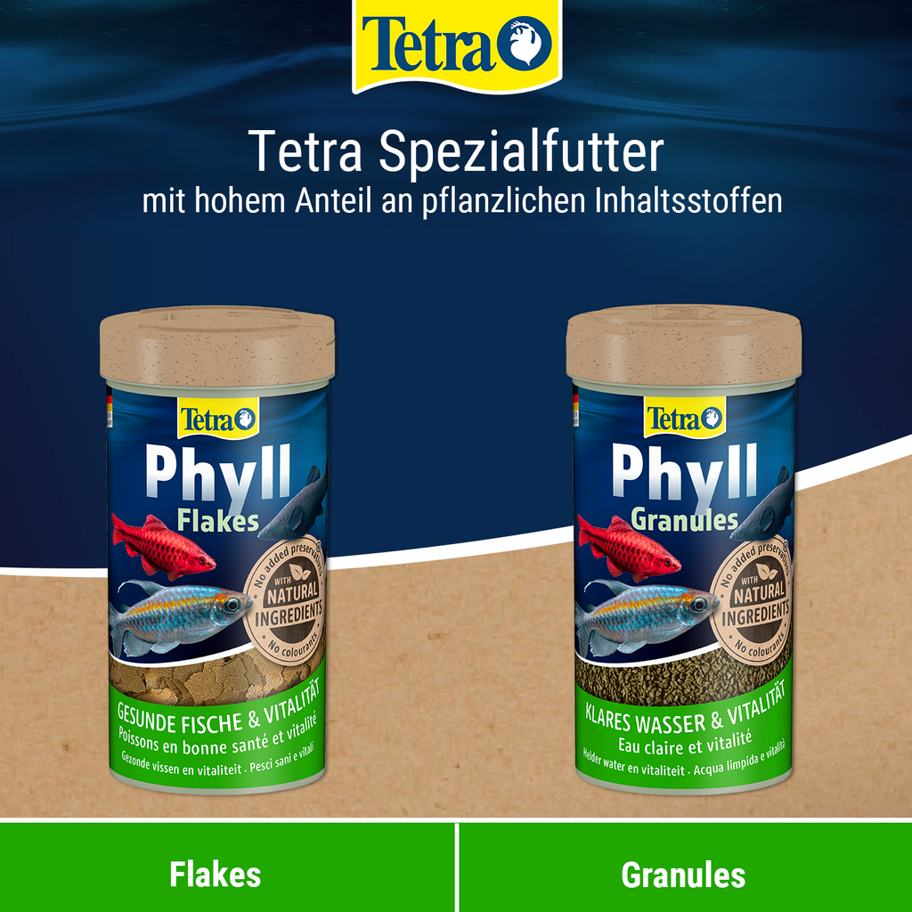 - TetraPhyll est un aliment végétal de base à distribuer plusieurs fois par jour en petites portions que les poissons peuvent consommer en quelques minutes.