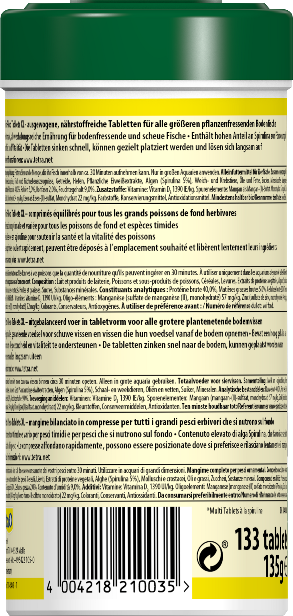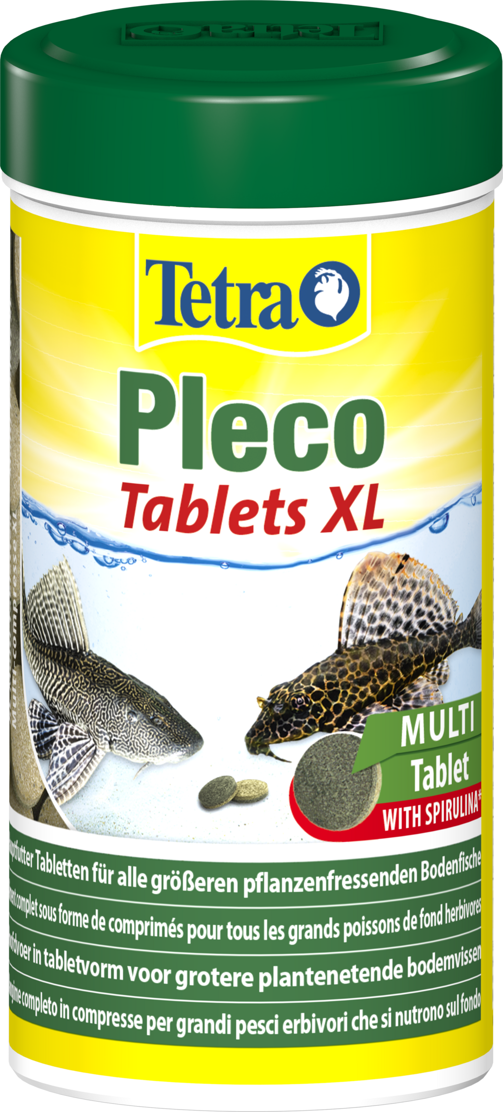Les comprimés Tetra Pleco XL sont un aliment principal sous forme de comprimés pour tous les poissons de fond herbivores dans les aquariums d'eau douce et sont disponibles dans différents récipients.