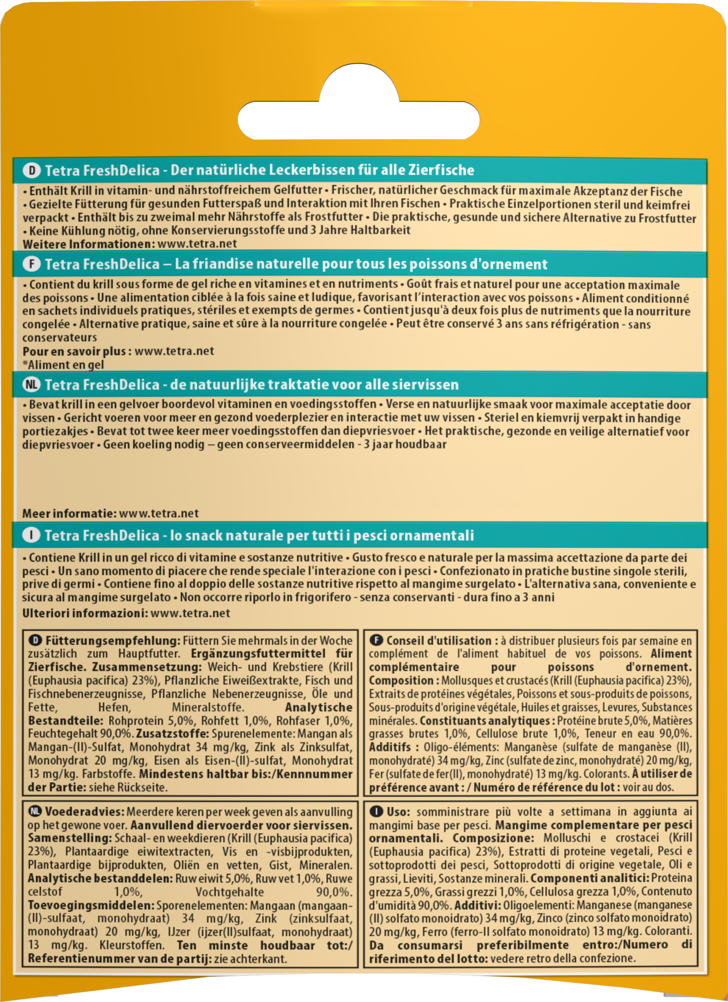 Tetra FreshDelica peut être donné plusieurs fois par semaine avec l'aliment principal en petites portions que les poissons peuvent manger en quelques minutes. La date de péremption sur l'emballage indique le moment jusqu'auquel le produit reste consommable, s'il est encore fermé et stocké correctement. La réfrigération n'est pas nécessaire. Même sans conservateurs, FreshDelica a une durée de conservation de trois ans et peut être stocké à température ambiante.