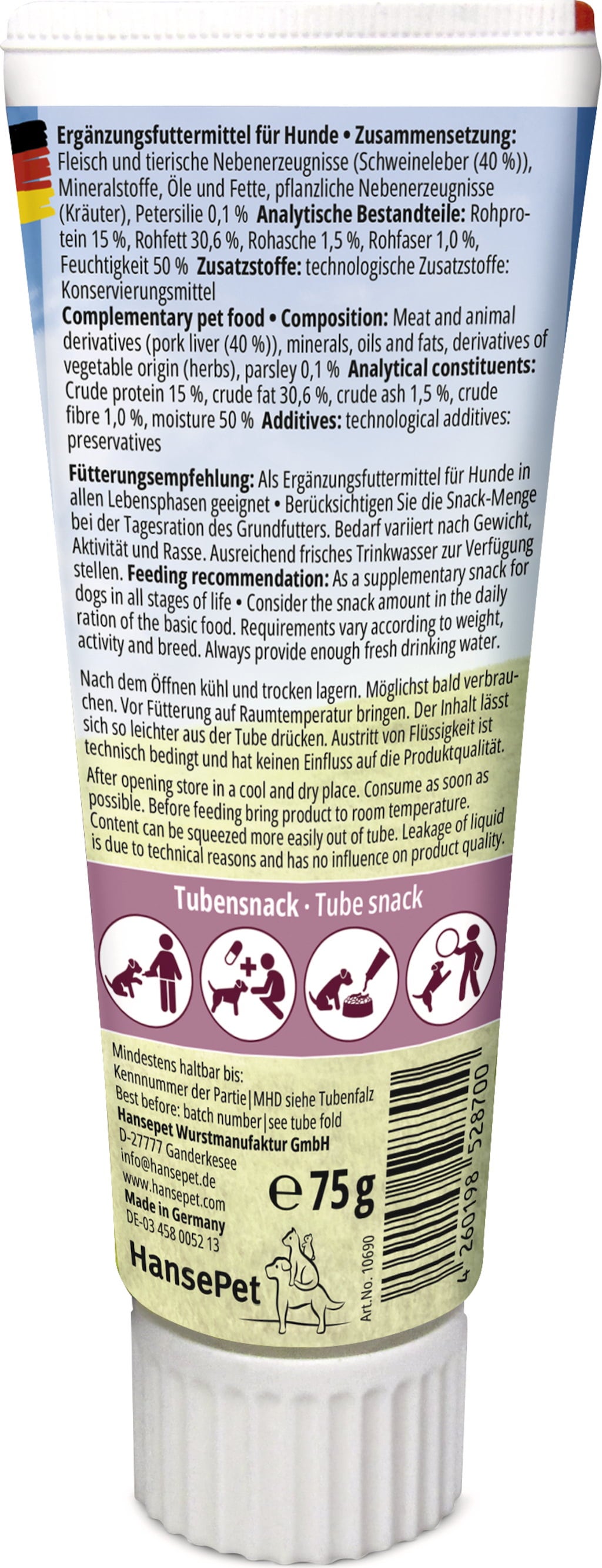 Pâté de viande de qualité à base de foie de porc frais de qualité alimentaire. La pâte peut être donnée très facilement directement depuis le tube, par exemple comme récompense pendant l’entraînement. Elle est également délicieuse en topping.