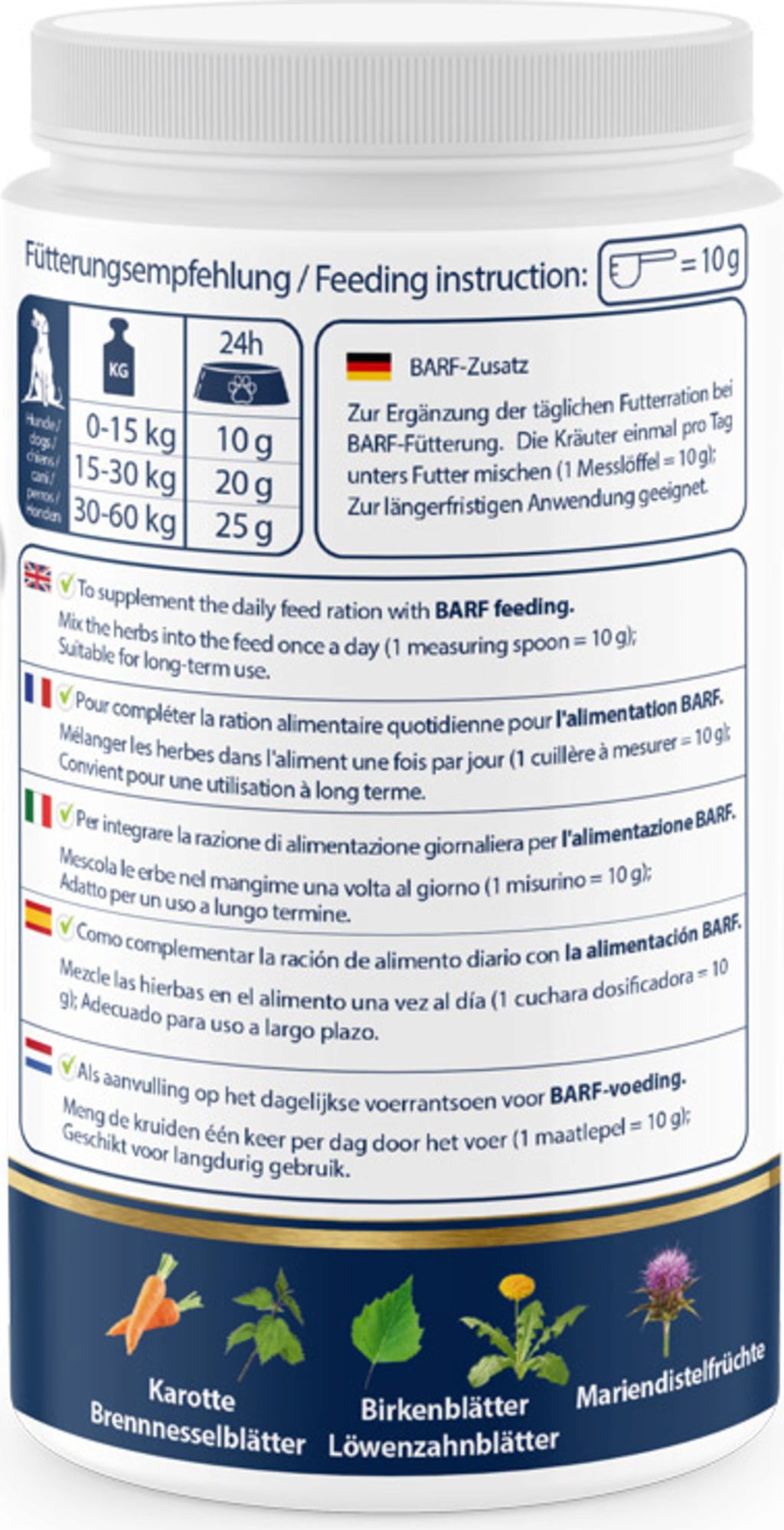 Plantes spéciales et légumes sélectionnées en poudre pour compléter un alimentation BARF. Comble partiellement les besoins alimentaires végétaux.