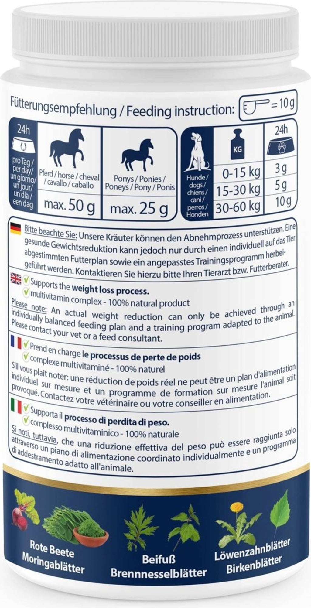 Convient à un usage préventif et sur le long terme. Une perte de poids saine ne peut être obtenue qu'avec un plan d'alimentation entièrement adapté à l'animal ainsi qu'un programme d'entraînement.