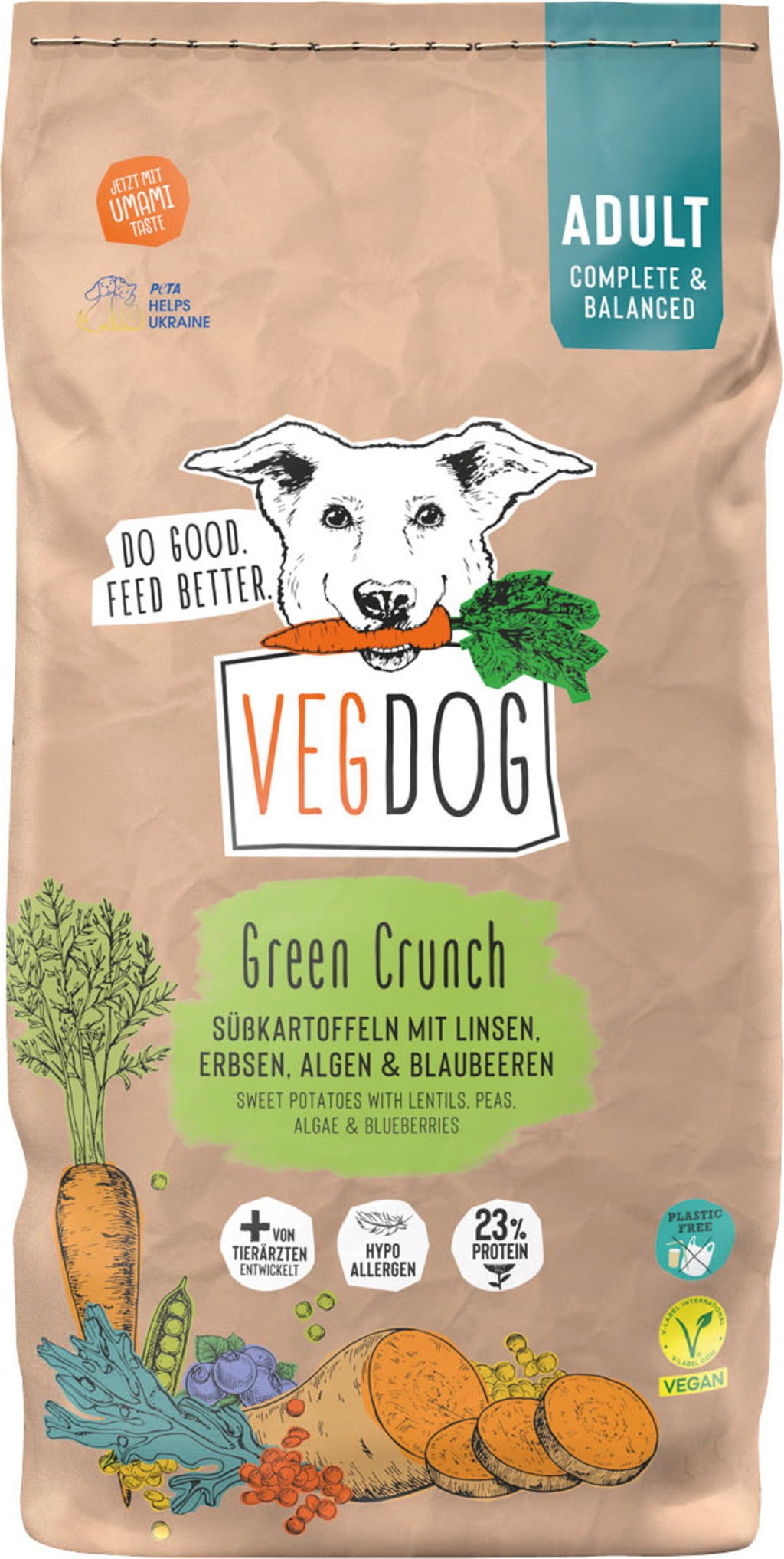 Les croquettes Green Crunch de VEGDOG fournissent des repas complets et équilibrés pour les chiens qui aiment le croquant dans leur gamelle ! Cet aliment vegan utilise une source de protéines végétales à base de lentilles et de pois au lieu d'une source animale. Sa recette savoureuse est agrémentée de délicieuses algues riches en acides gras oméga-3 et oméga-6, ainsi que de patates douces, de courge, de carottes, de myrtilles et du mélange de minéraux spécial VEGDOG.