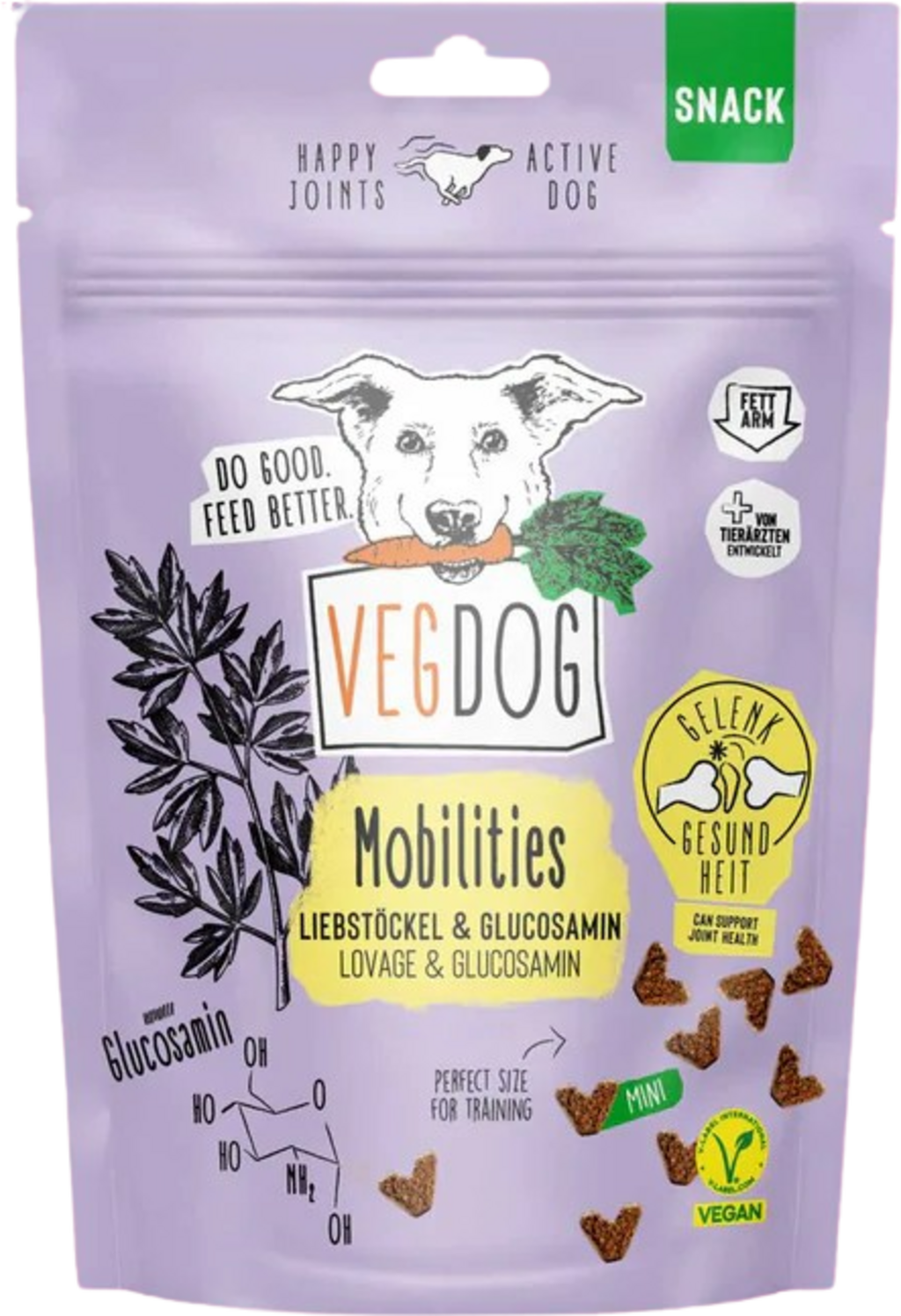 Les Mobilities Minis de VEGDOG sont des friandises à mâcher pauvres en matières grasses, riches en glucosamine végétale, pouvant ainsi contribuer au fonctionnement normal des articulations.