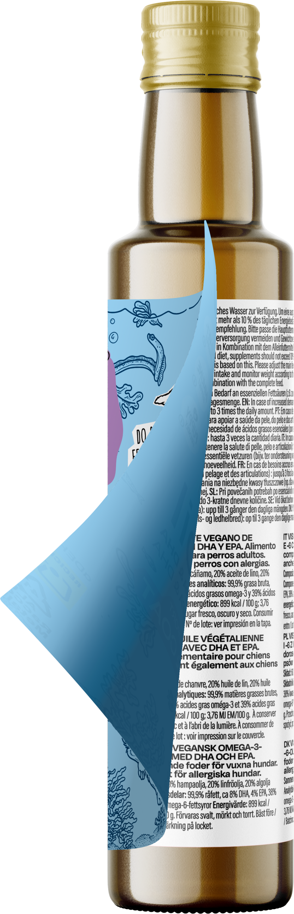 La Vish Oil de VEGDOG est une alternative végane à l'huile de poisson disponible sur le marché. Au lieu d'une source animale, seules des matières premières végétales telles que l'huile de chanvre, d'algues et de lin sont utilisées pour la production de cette huile. Celles-ci sont non seulement riches en acides gras oméga-3 et oméga-6, mais aussi beaucoup plus durables, respectueuses des animaux et de l'environnement que l'huile de poisson.