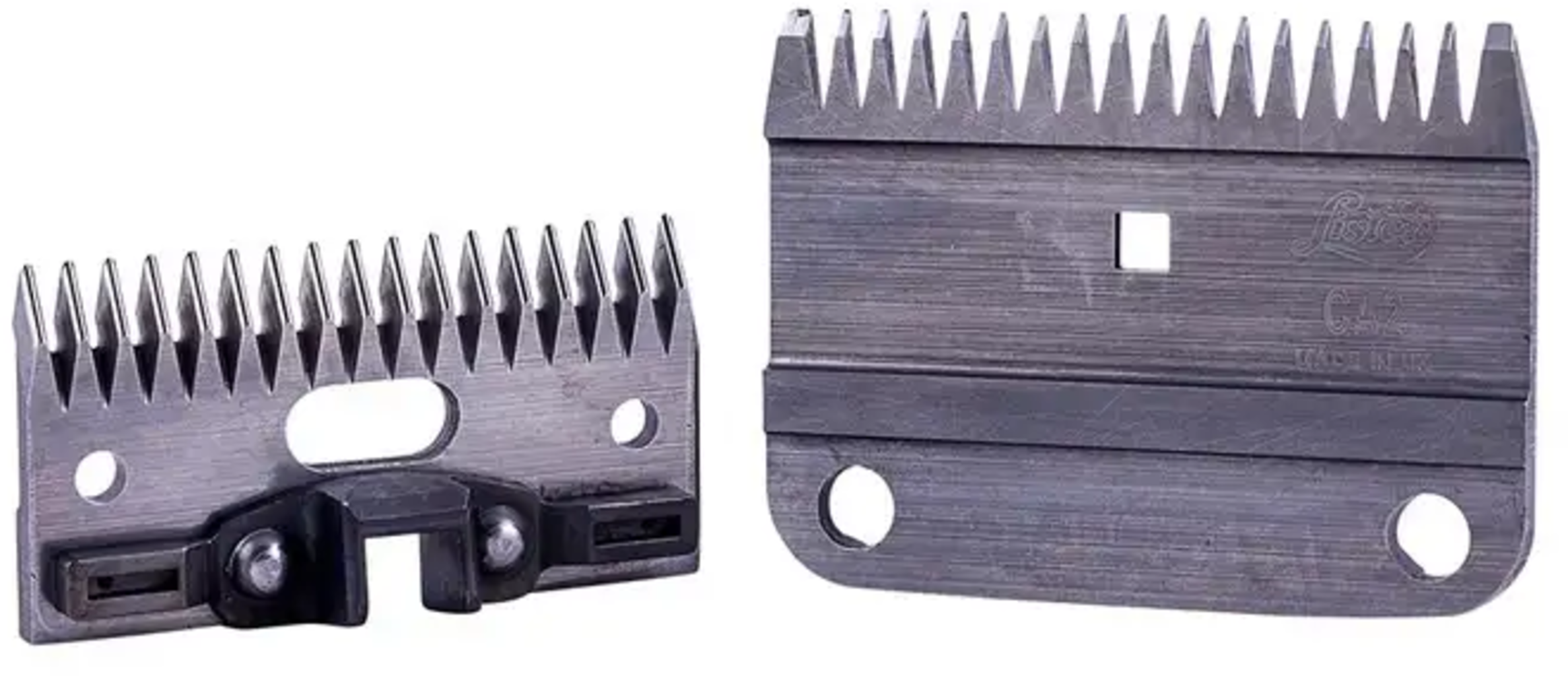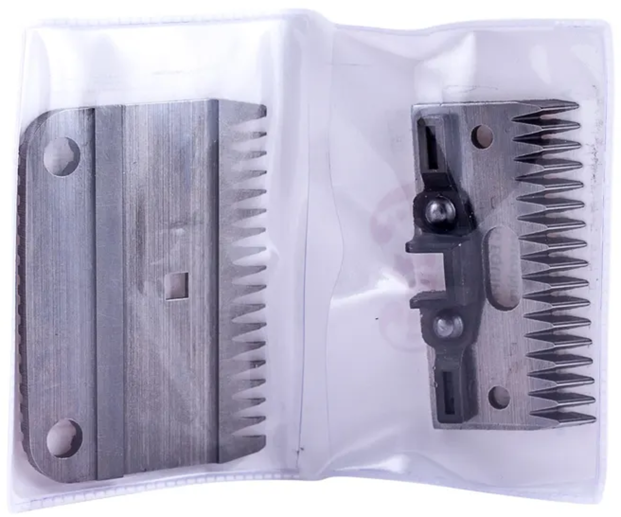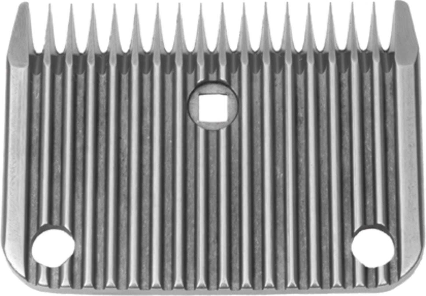 Ensemble professionnel interchangeable en acier inoxydable. Il offre une largeur de coupe de 75 mm, 18 dents et une longueur de coupe de 2,5 mm. Cet accessoire, doté de dents très épaisses, est particulièrement adapté à la tonte des zones sales et résistantes.