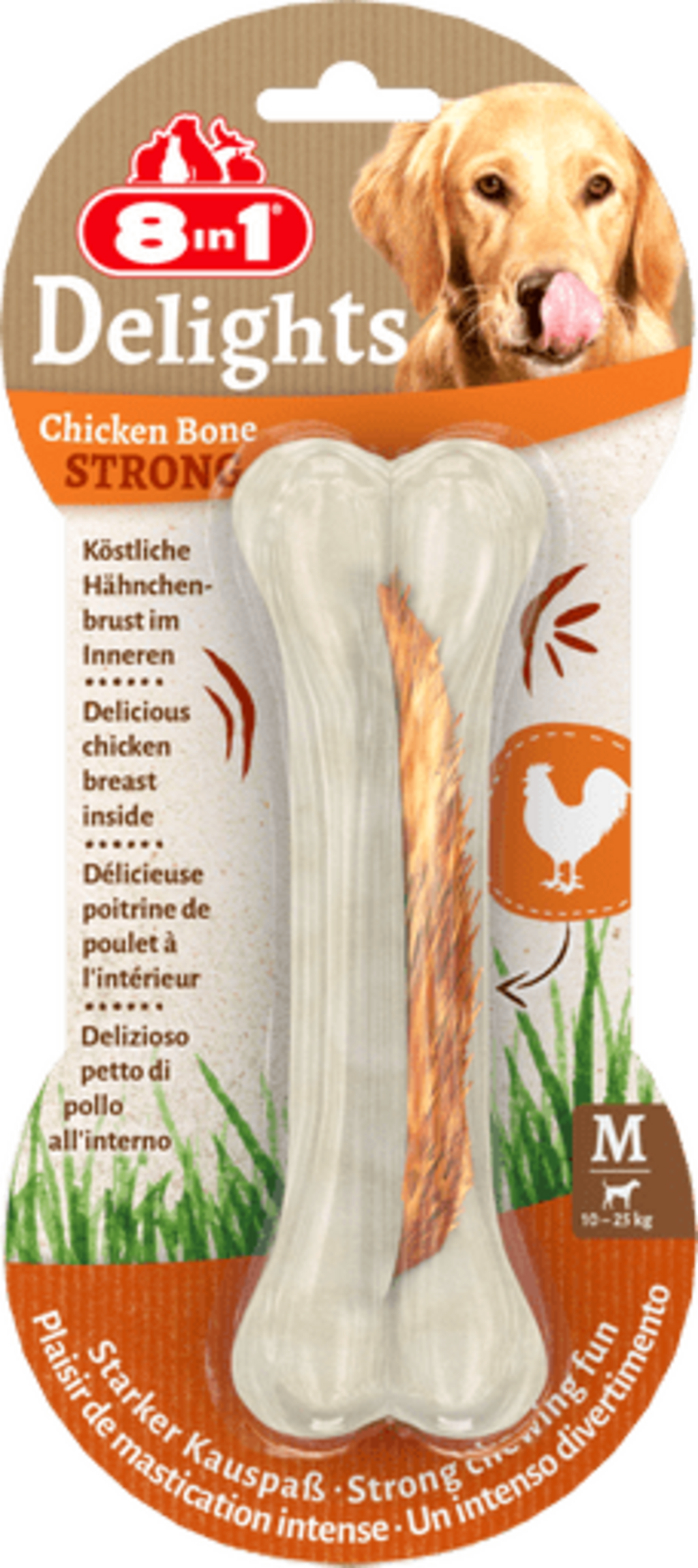 L'Osso da Masticare Strong di 8in1 è uno snack gustoso e nutriente, che grazie alla sua texure più dura si adatta particolarmente bene ai cani che amano rosicchiare! Lo snack a basso contenuto di grassi contiene pelle bovina e petto di pollo all'interno. Inoltre, è perfetto tra un pasto e l'altro! Lo snack cotto nel forno contiene molte proteine ed è privo di coloranti artificiali o esaltatori di sapidità. Poiché lo snack non ha zuccheri aggiunti, OGM o glutine, è un ottimo complemento al cibo convenzionale.