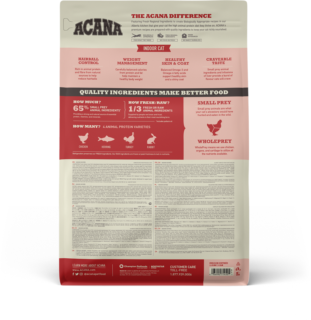 Grazie agli ingredienti di alta qualità, Adult Cat Indoor Entrée di ACANA™ assicura una vita quotidiana felice e attiva, sia per te che per il tuo gatto.