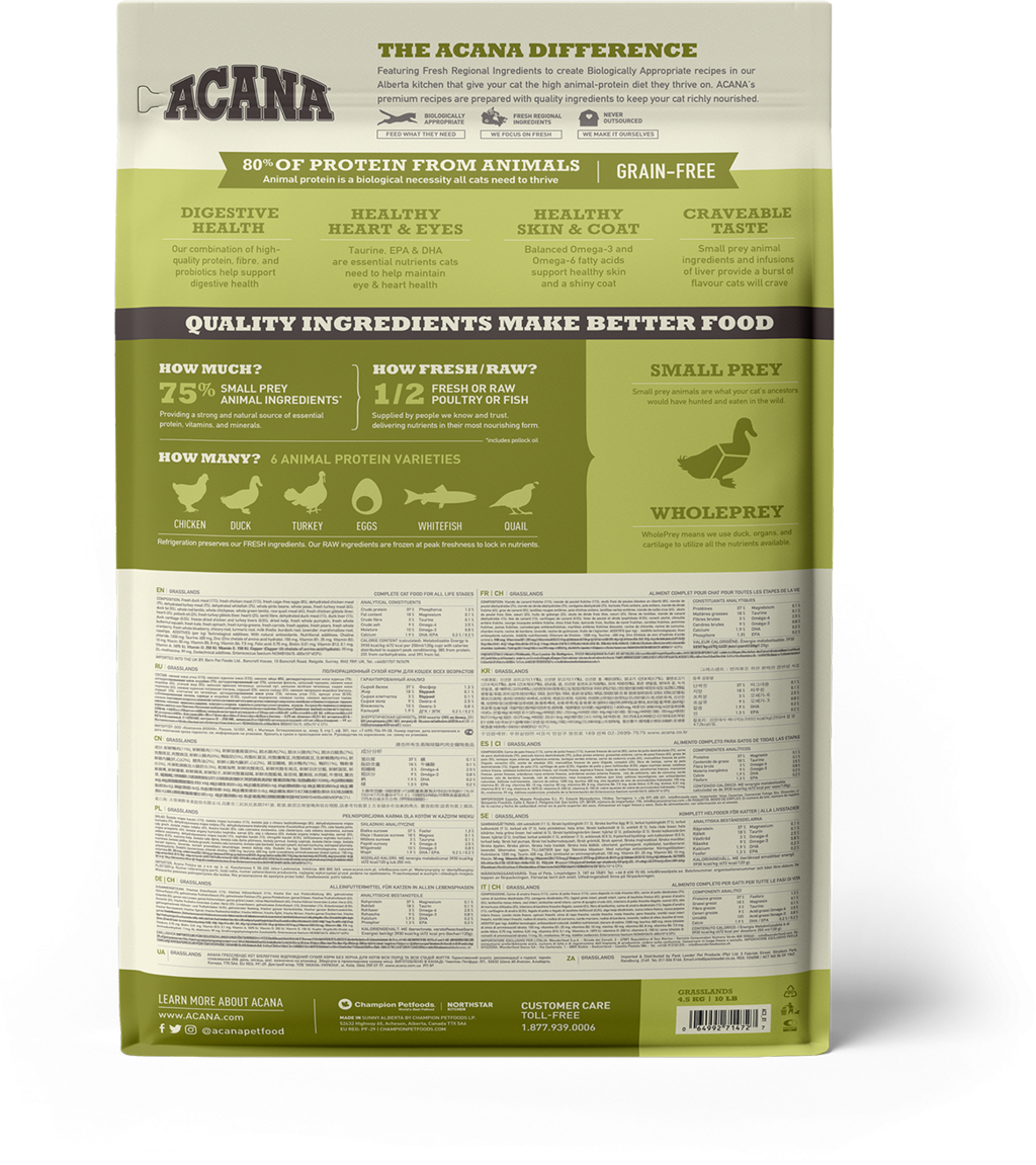 Offri al tuo gatto un pasto di alta qualità con Cat Grasslands di ACANA™! Questa ricetta combina proteine animali di prima qualità con fibre preziose e probiotici, per un'alimentazione equilibrata.