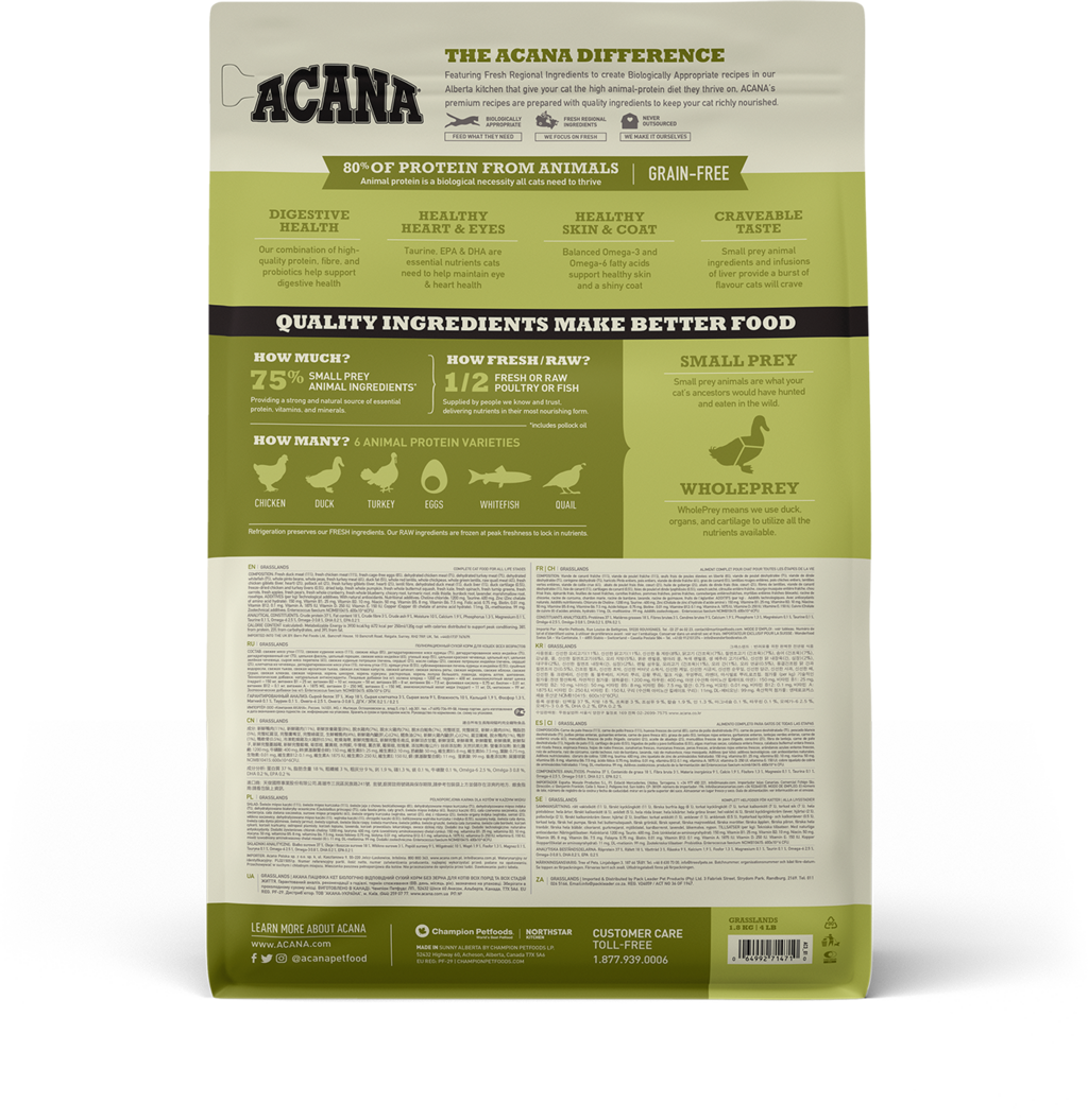 Grazie a ingredienti accuratamente selezionati, come anatra, pollo, tacchino, quaglia, pesce e uova, ACANA™ offre un'esperienza di gusto a cui i gatti difficilmente potranno resistere. Inoltre, nutrienti essenziali come taurina, EPA e DHA forniscono preziosi elementi costitutivi per soddisfare le esigenze quotidiane del tuo amico peloso.