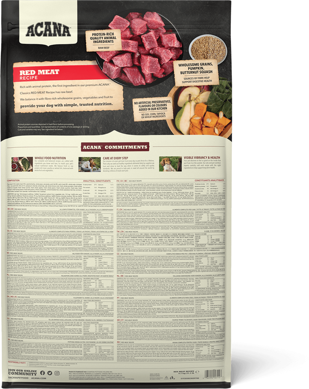 Il tuo cane merita solo il meglio, ed è esattamente ciò che offre Dog Red Meat Recipe di ACANA™. Con il 50% di ingredienti di origine animale di alta qualità, questo cibo di prima qualità per cani fornisce preziose proteine di manzo, maiale e agnello. La ricetta è ricca di nutrienti e segue il collaudato principio della "preda intera", combinando carne, frattaglie e ossa: esattamente ciò che i cani amano istintivamente!