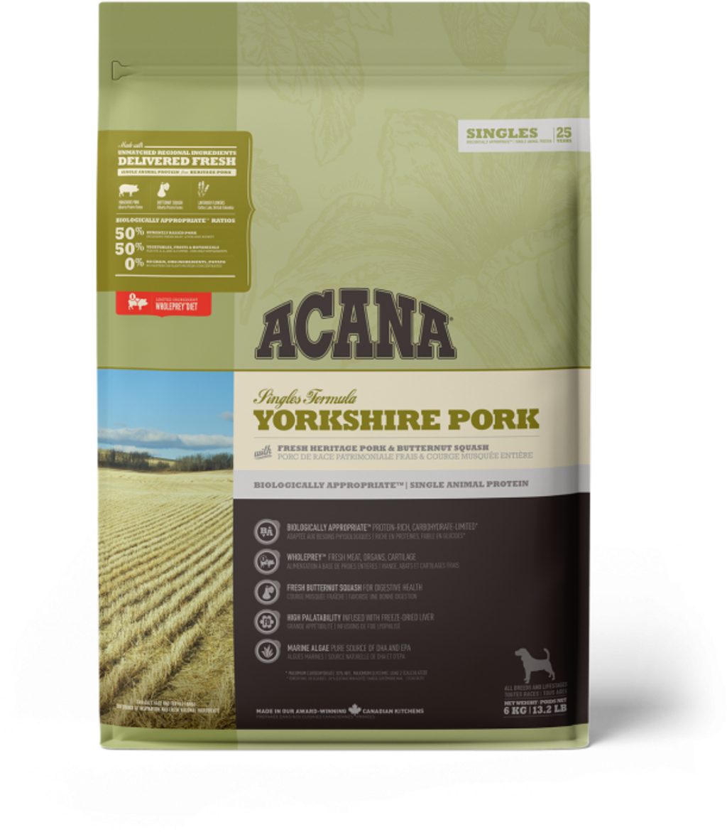 Cerchi cibo secco nutriente e di alta qualità per il tuo cane? Yorkshire Pork di ACANA™ utilizza ingredienti di alta qualità con un'elevata percentuale di carne di maiale fresca e cruda. Con il 50% di maiale Yorkshire e un contenuto proteico del 31%, fornisce esattamente ciò di cui il tuo amico a quattro zampe ha bisogno.