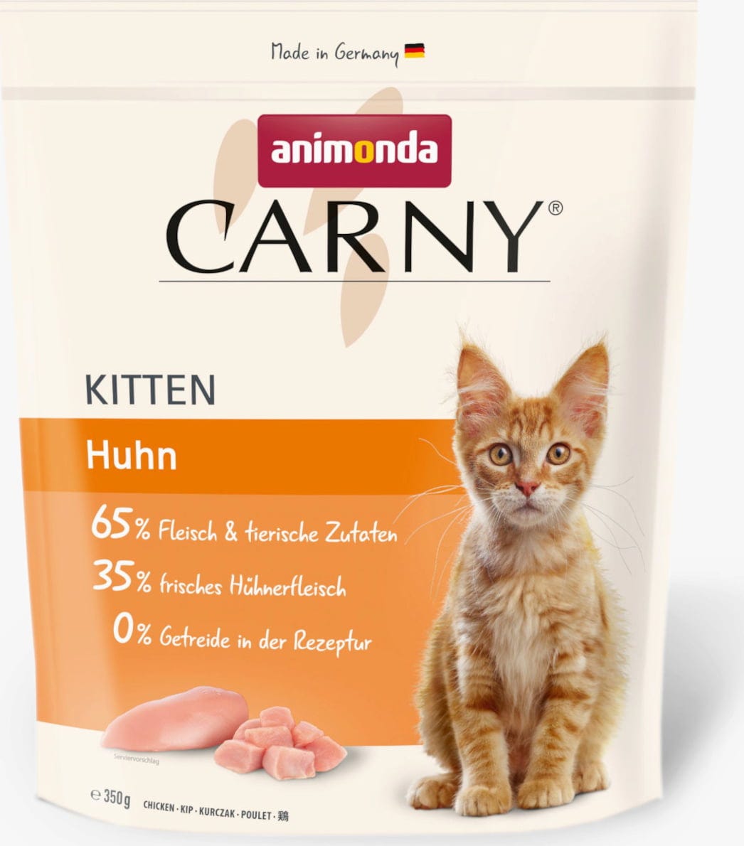Secco, croccante e irresistibile. Il cibo secco Carny Kitten è composto per il 35% da pollo fresco ed è completamente privo di cereali, soia, zucchero e coloranti artificiali.