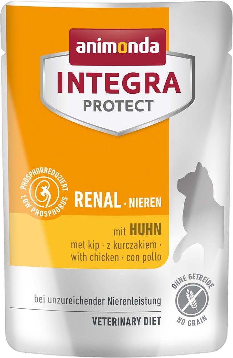 Il cibo umido Integra Protect Renal supporta la funzione renale dei gatti che soffrono di insufficienza renale cronica. Rispetto ai prodotti convenzionali, questo alimento speciale contiene meno proteine e quindi produce meno urea nel metabolismo proteico, proteggendo i reni a lungo termine. Il prodotto è a ridotto contenuto di fosforo per rallentare la progressione della malattia. L'alimento umido speciale contiene deliziosi pezzi di tenero pollo. Senza cereali!