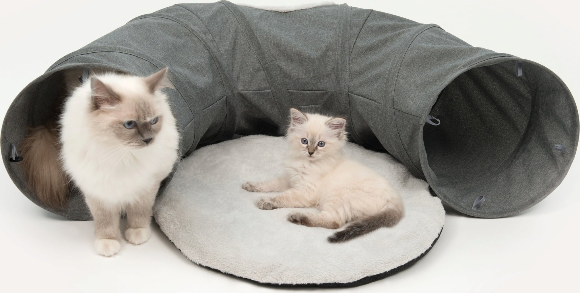 Il tunnel Vesper è realizzato con tessuti di alta qualità, ha aperture su entrambe le estremità e una terza apertura al centro. L'accessorio è completato con un comodo cuscino su cui riposare e una pallina.