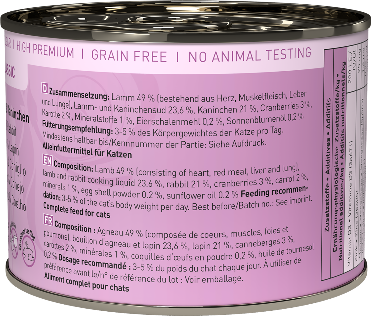 49 % agnello (fegato, muscolo, polmone), 23,6 % brodo di agnello e coniglio, 21 % coniglio (muscolo, fegato), 3 % mirtilli rossi, 2 % carota, 1 % minerali, 0,2 % gusci d'uovo, 0,2 % olio di girasole