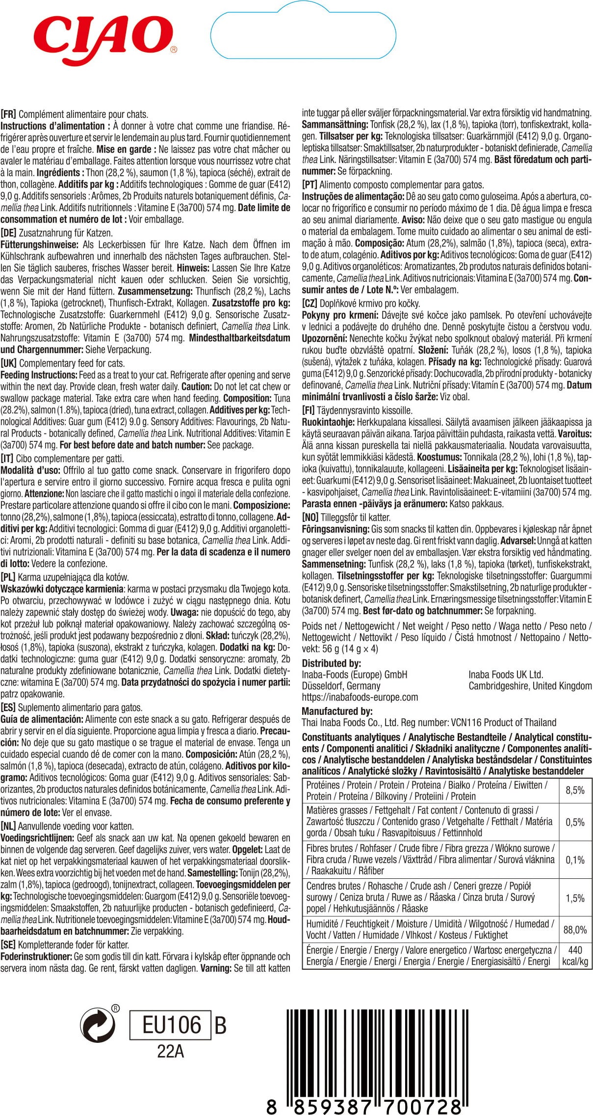 28,2 % tonno, 1,8 % salmone, tapioca, estratto di tonno, collagene, estratto di tè verde