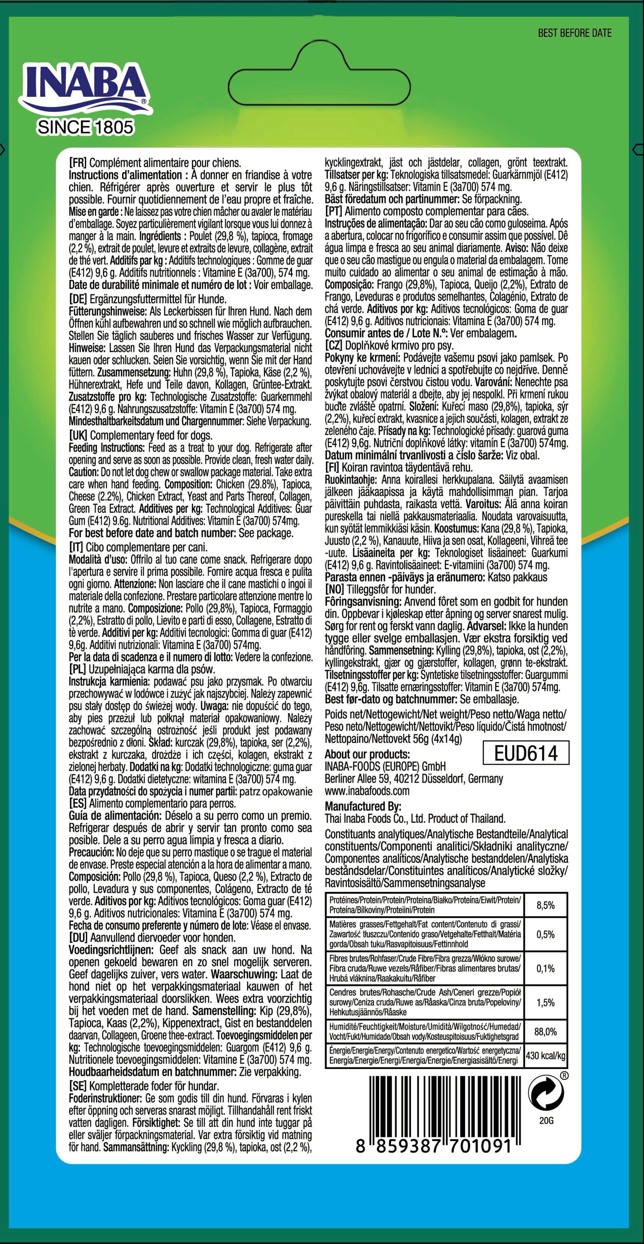 30,2 % pollo, tapioca, 1,8 % salmone, estratto di carne di pollo, lievito, collagene, estratto di tè verde, gomma di guar