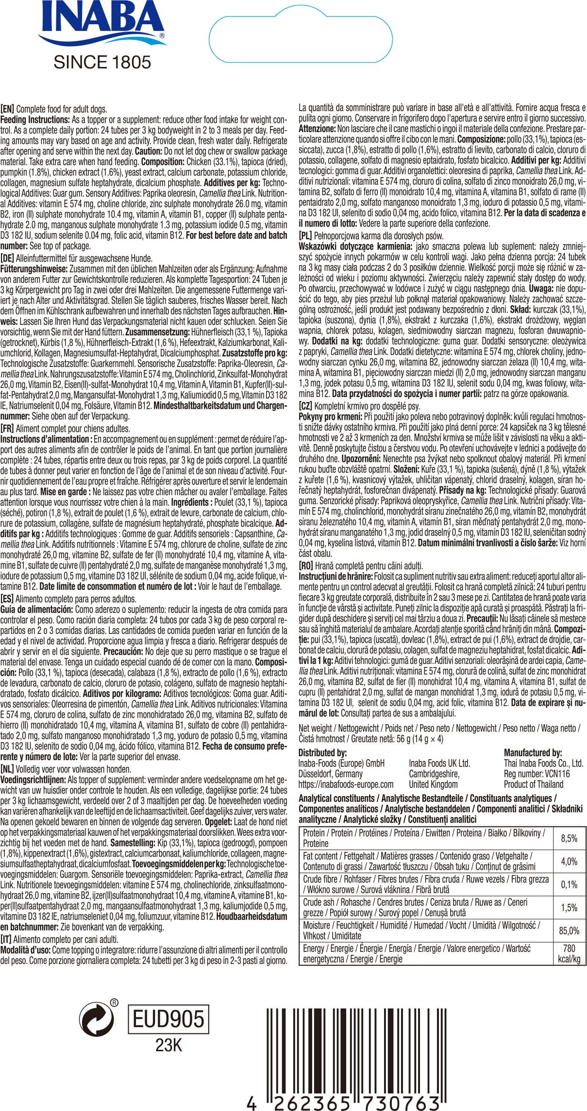33,1 % carne di pollo, tapioca essiccata, 1,8 % zucca, 1,6 % carne di pollo, estratto di lievito, carbonato di calcio, cloruro di potassio, collagene, solfato di magnesio eptaidrato, fosfato bicalcico