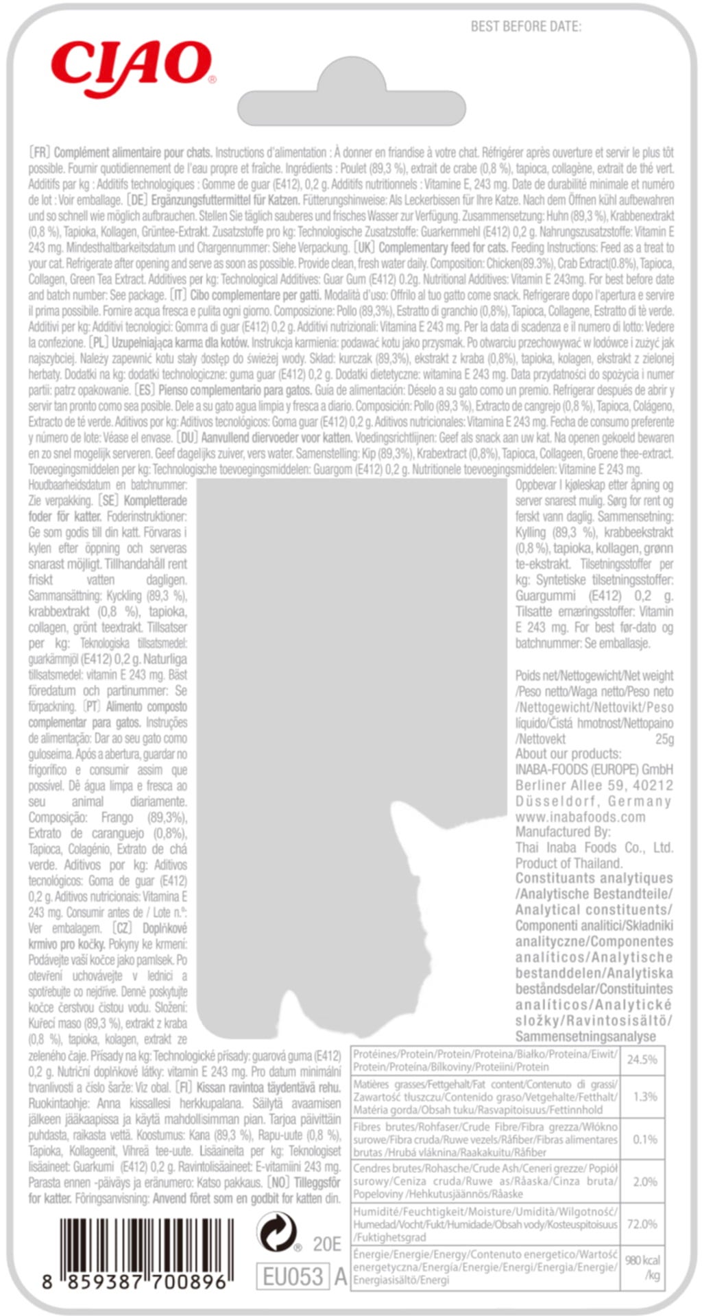Churu Snack per Gatti - Filetto di Pollo Grigliato, Extra tenero in brodo al gusto di granchio (25 g)