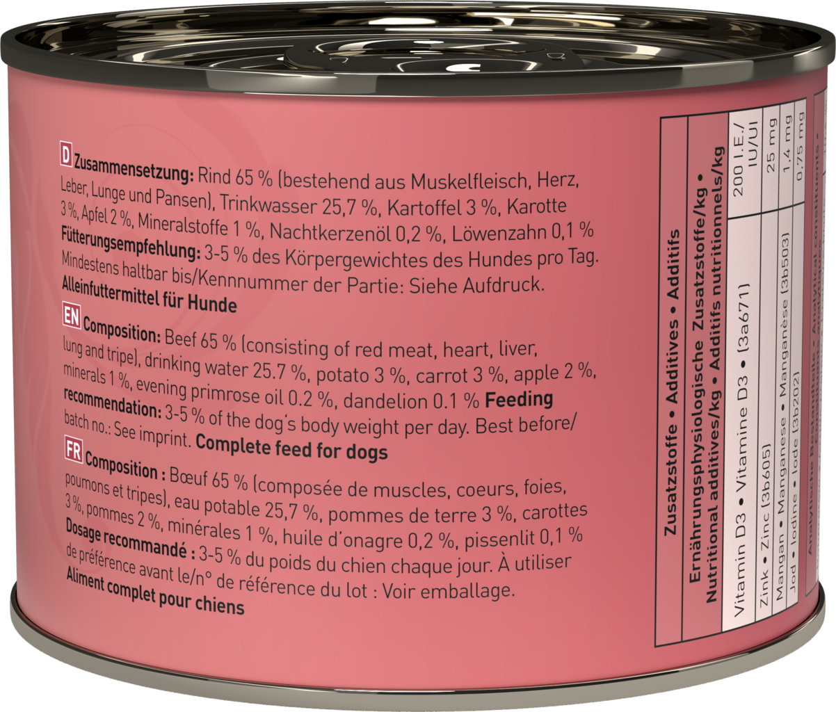 65 % manzo (muscolo, cuore, fegato, polmone, rumine), 25,7 % acqua, 3 % patate, 1 % minerali, 0,2 % olio di enotera, 0,1 % foglie di tarassaco
