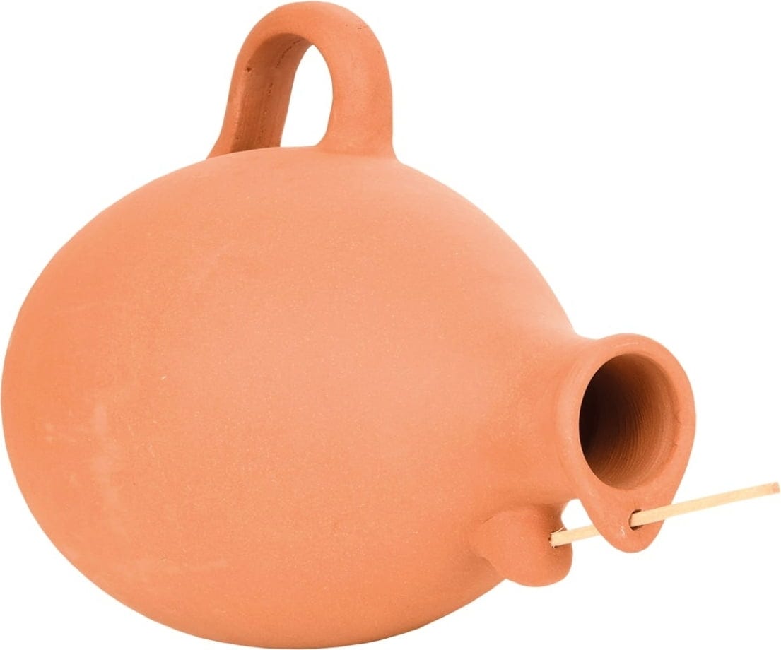 - Materiali: terracotta resistente al gelo e trespolo di legno.