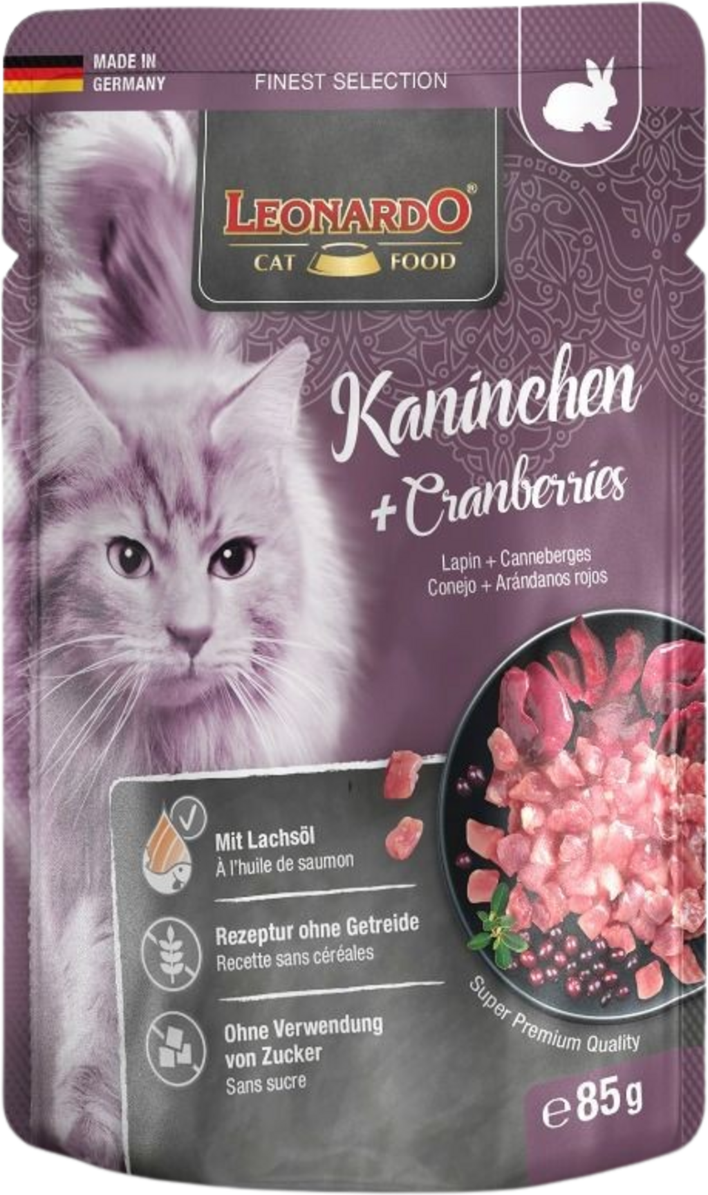La carne succosa e le gustose frattaglie di coniglio, pollo e manzo vengono arricchite con i cranberry superfood, trasformando ogni pasto in un vero highlight culinario! Gli ingredienti accuratamente selezionati vengono cotti in sacchetti monoporzione e raffinati con pregiato olio di salmone.