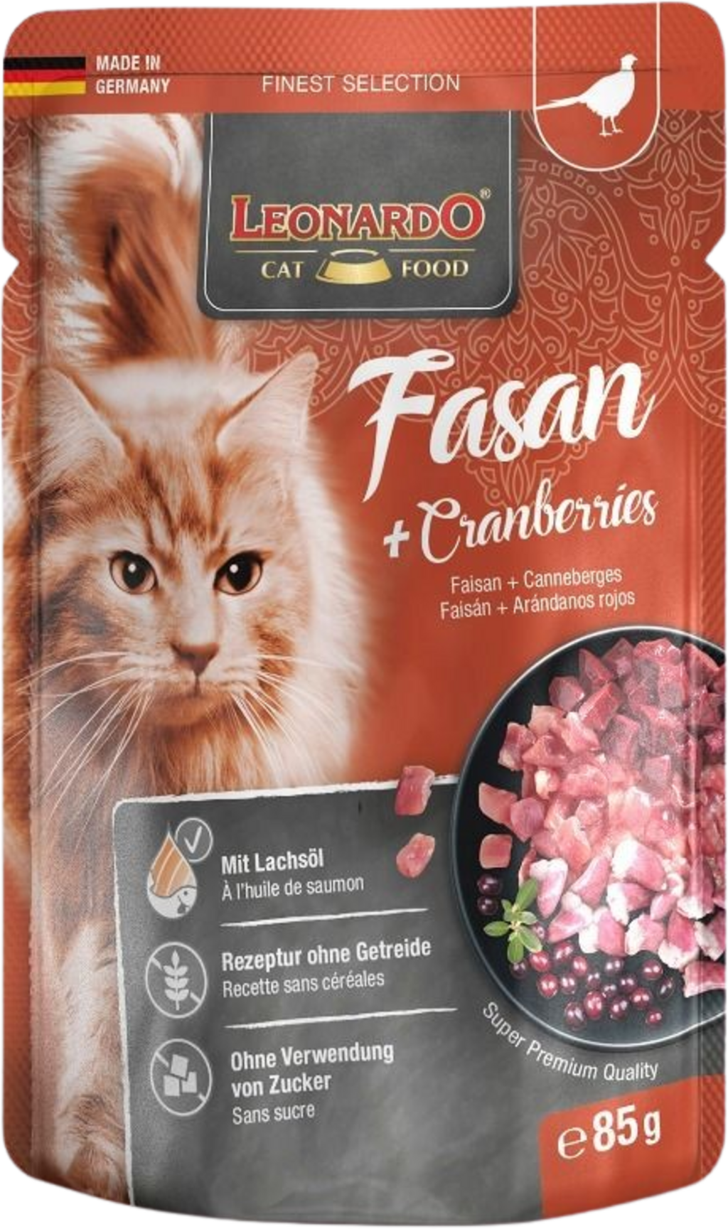 La succosa carne di fagiano e le gustose interiora di pollo vengono arricchite con i mirtilli rossi superfood, trasformando ogni pasto in un vero highlight culinario! Gli ingredienti accuratamente selezionati vengono cotti in sacchetti monoporzione e raffinati con pregiato olio di salmone.