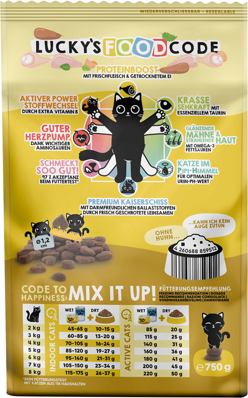 Food Code di Lucky Lou è un alimento secco di altissima qualità perché non solo ha un sapore irresistibilmente croccante e delizioso, ma fornisce anche al tuo gatto nutrienti preziosi adatti alla sua età. Ispirata alle proporzioni perfette dell'Uomo Vitruviano di Leonardo da Vinci, la ricetta bilanciata di questo cibo secco offre 8 benefici per ogni varietà, che coccolano il tuo gatto in modo olistico.