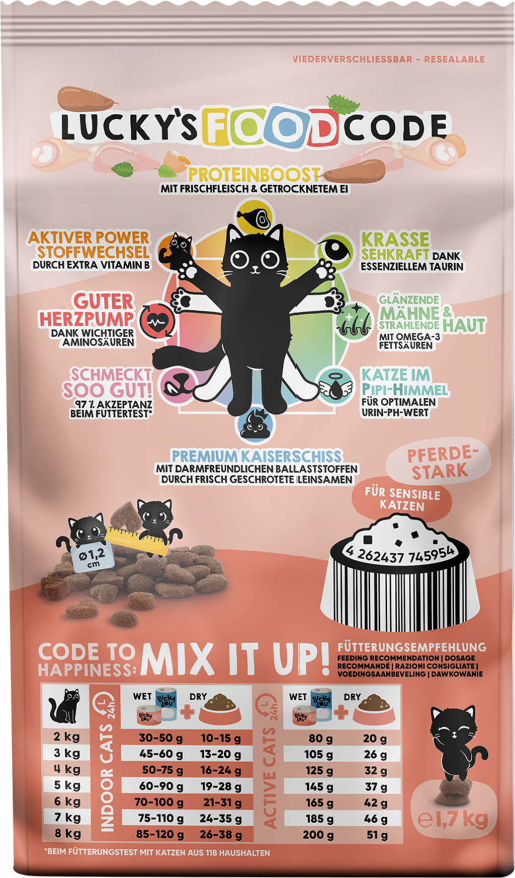 Food Code di Lucky Lou è un alimento secco di altissima qualità perché non solo ha un sapore irresistibilmente croccante e delizioso, ma fornisce anche al tuo gatto nutrienti preziosi adatti alla sua età. Ispirata alle proporzioni perfette dell'Uomo Vitruviano di Leonardo da Vinci, la ricetta bilanciata di questo cibo secco offre 8 benefici per ogni varietà, che coccolano il tuo gatto in modo olistico.