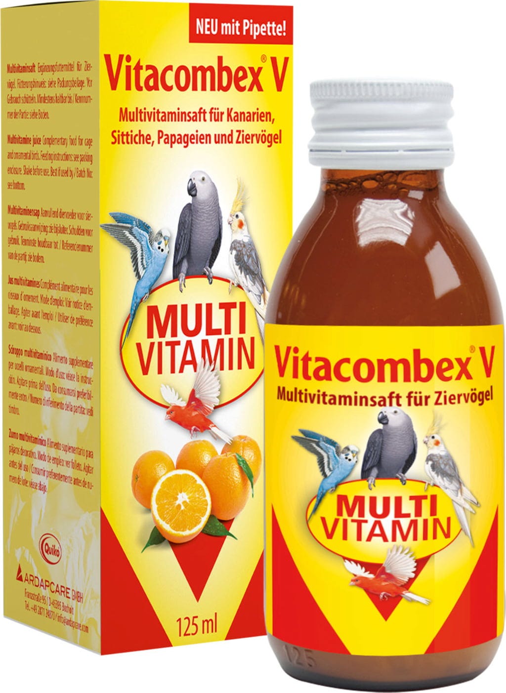 Questo gustoso succo multivitaminico è stato sviluppato appositamente per le esigenze degli uccelli da compagnia come canarini, parrocchetti, pappagalli e tutti gli uccelli da gabbia e voliera. Supporta il regolare apporto di vitamine. Può essere somministrato attraverso il cibo o l'acqua potabile.