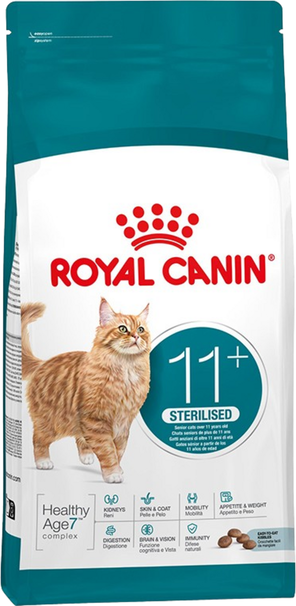 AGEING 11+ STERILISED di ROYAL CANIN® è un alimento secco per gatti sterilizzati/castrati a partire dagli 11 anni di età. AGEING 11+ STERILISED è stato sviluppato e testato per gatti anziani. Contiene crocchette facili da masticare per offrire al tuo gatto un'esperienza di alimentazione piacevole.