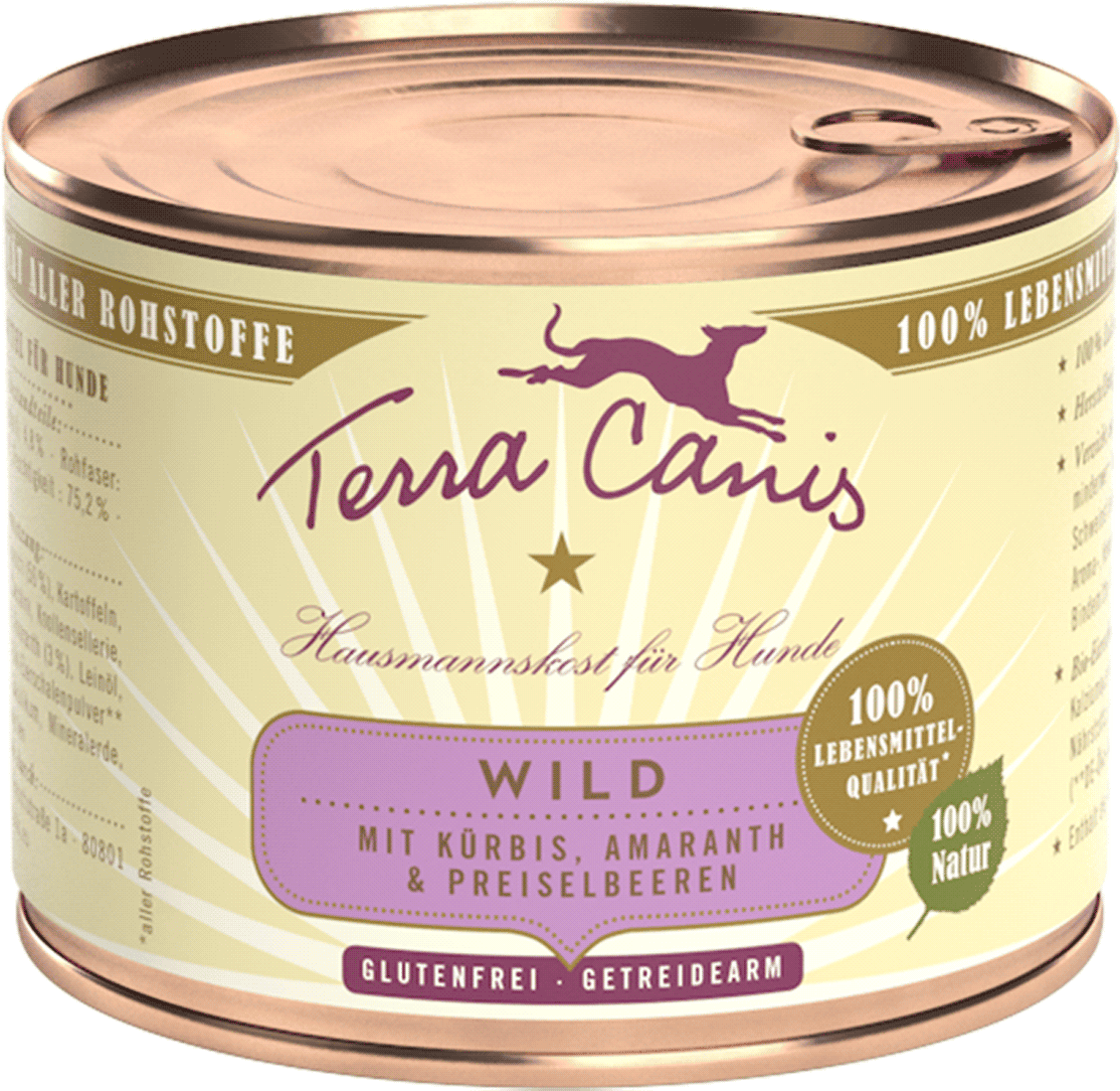 47 % carne di muscolo di capriolo e cervo, patate, carota, 8 % zucca, zucchine, sedano rapa, yogurt magro, barbabietola, 3 % amaranto, olio di colza, gusci di ostriche, lievito di birra, 6 % mirtilli, erba cipollina, basilico, terra minerale, polline, alghe, minerali