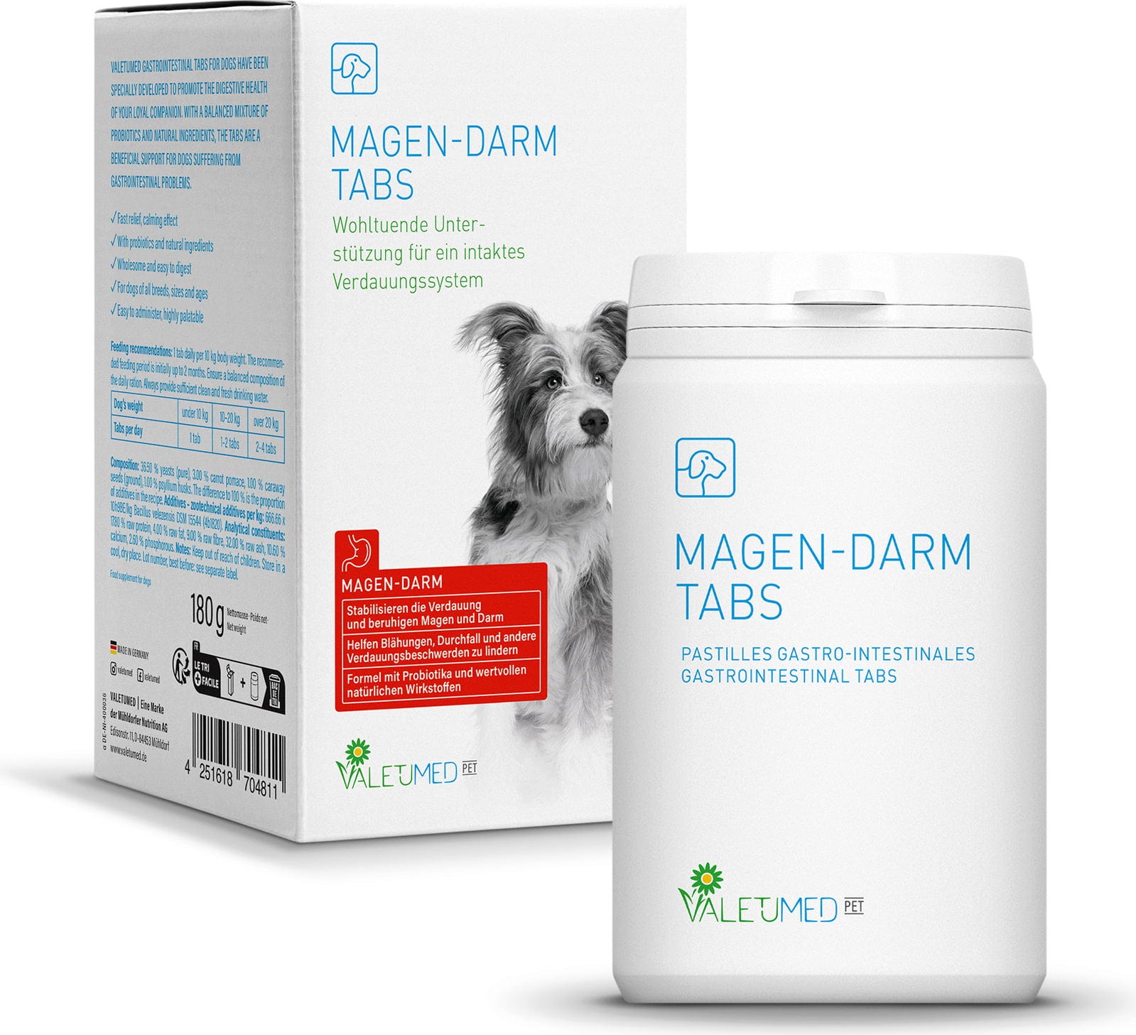Le compresse per il sistema gastrointestinale di Valetumed sono formulate specificamente per supportare delicatamente la normale digestione del tuo cane. La miscela bilanciata di probiotici e ingredienti naturali come lievito puro, polpa di carota, semi di cumino e bucce di psillio fornisce un integratore ottimale all'alimentazione quotidiana del tuo cane.